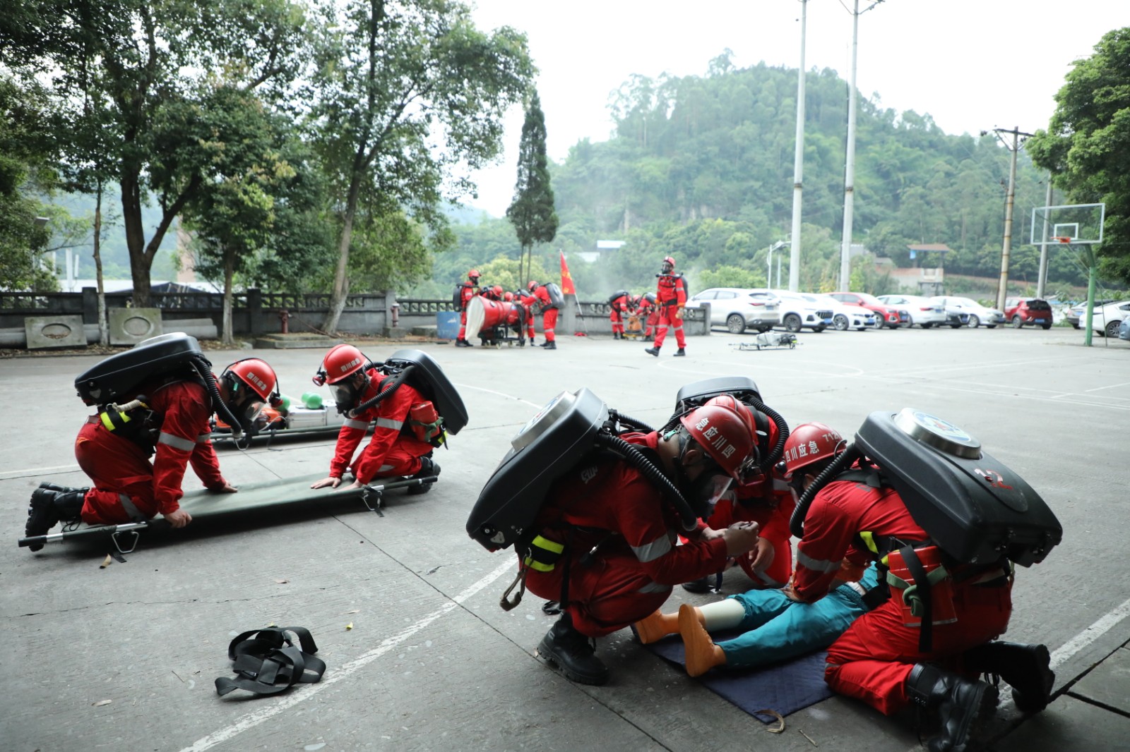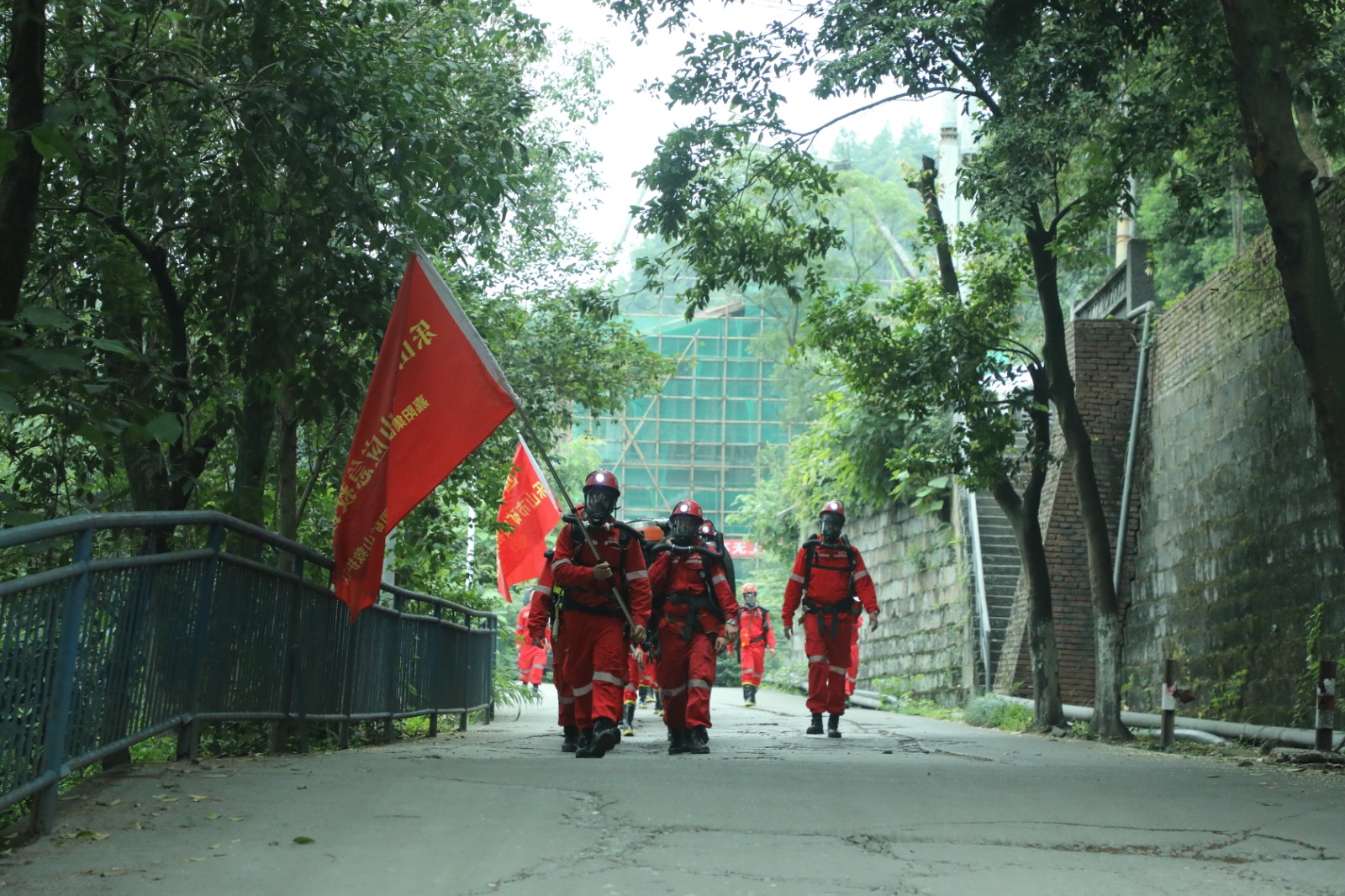 此次演练以复杂条件下的救援演练为主,全程佩带重达13公斤的氧气呼吸器,着重在于培养救援队员的耐氧度和高湿条件下的佩机忍耐力。战前分工、受领任务、集合队伍、整装待发,上午9点30分,万米戴机行走在指挥员响亮的口令中拉开了演练的序幕,佩带齐全装备的队员们向着目的地一路进发,一身国旗红在矿区、在山间路上格外引人注目。互换氧气瓶、伤员急救包扎转运模拟、安设高泡灭火机灭火、高温浓烟,各小队按照任务分工迅速到达指定地点有序展开工作。在两个多小时的训练中,队员们团结协作、密切配合,圆满完成了指定任务。通过联合演练,检验了队员们的身体素质、技战术水平、应急反应能力和团结协作能力,确保队伍战时拉得出、冲得上、打得赢。