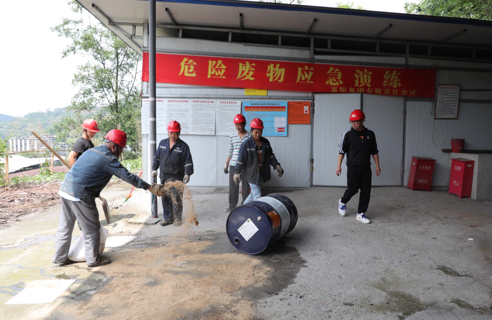 演练模拟搬运改制班在卸废旧油桶时,桶盖未盖紧,导致桶内余油泄漏,出现环境污染安全风险。相关人员立即启动应急处置预案,一边迅速疏散人员、拉开警戒线,一边用沙土、棉纱吸收废液,用消防铲清理含有危废物的消防沙等……整个演练过程井然有序。