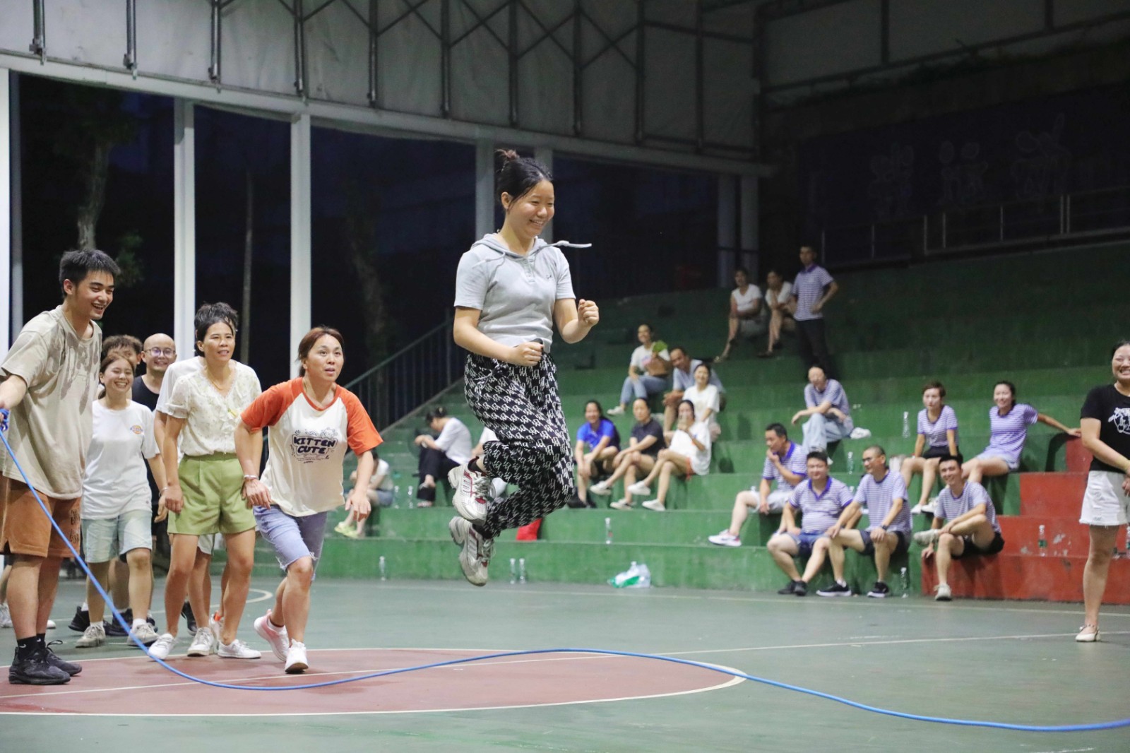 此次趣味运动会精心设置了一系列妙趣横生的项目,包括“跳大绳接力”“步调一致”“海底传月”“滚铁环接力”“地上投篮”,吸引广大职工的热情参与。“加油,冲冲冲!”在围观职工家属的助威声中,滚铁环的队员像箭一样冲出去,铁环倒了立马捡起来重新出发,一刻也不犹豫。队员一个接一个地出发,交接的是铁钩铁环,传递的是童年时的快乐,欢快的加油助威声浪带火了比赛,让参与者玩嗨了,围观者也乐翻了。“跳大绳接力”项目每一次跳跃都尽显风采,也跳出了许多有趣的“表情包”;“步调一致”项目协力而行,赛场上的每一句“左右左”都喊在了荣耀之路上。