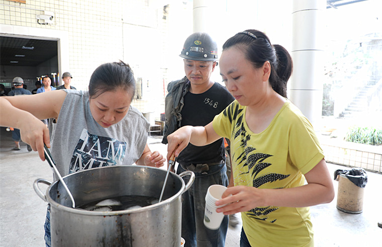 26日下午,煤矿女工委也组织开展了“送清凉”活动,女工们将制好的冰粉送到天锡井井口,送到煤矿出入井职工手中,在“送清凉”的同时不忘叮嘱下井职工注意安全。据煤矿女工委的同志介绍这样的活动她们还会在炎热的夏天持续开展。除了定点送冰粉,还为每个车间配备了藿香正气水、风油精等防暑降温药品,采取多种措施落实防暑降温和劳动保护工作,切实保障广大职工的身体健康,促进公司的安全生产。