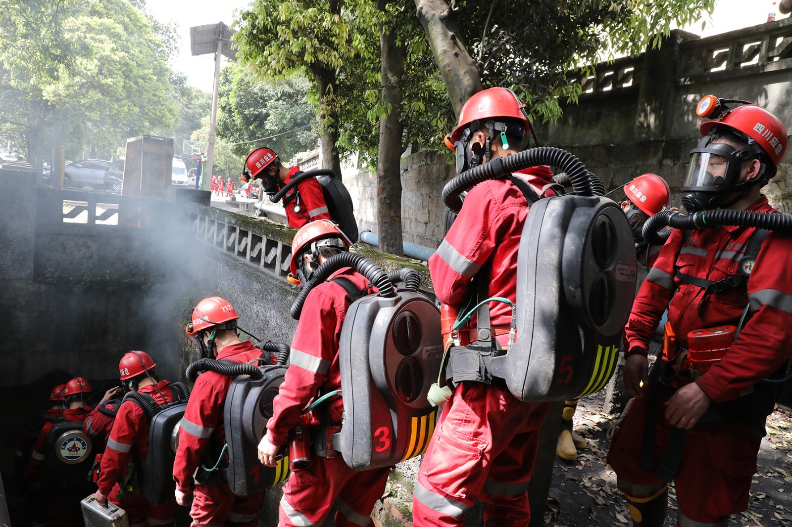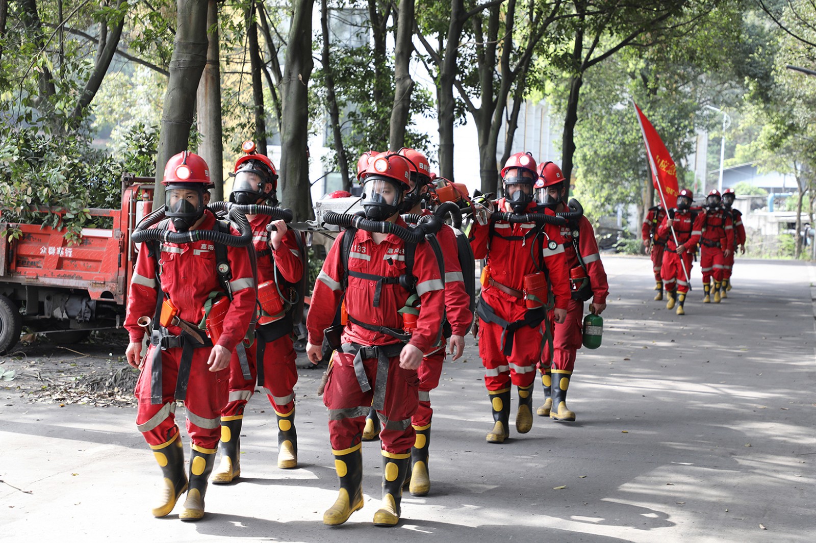 演练在模拟矿山灾害事故的紧张氛围中正式启动。闻警出动中,乐山队值班小队迅速反应,以最快速度奔赴现场,待机小队与嘉阳队也毫不懈怠,紧跟其后。各小队在集团公司救护队训练场迅速集结,有序领受任务。随后,各小队队长严格按照标准化流程,组织队员对各类救援装备进行细致检查,确保装备性能完好,为后续救援工作提供坚实保障。