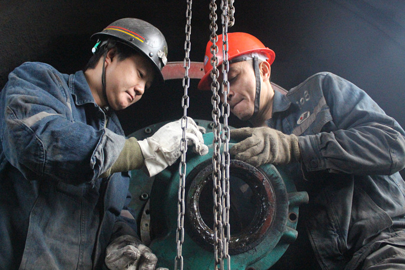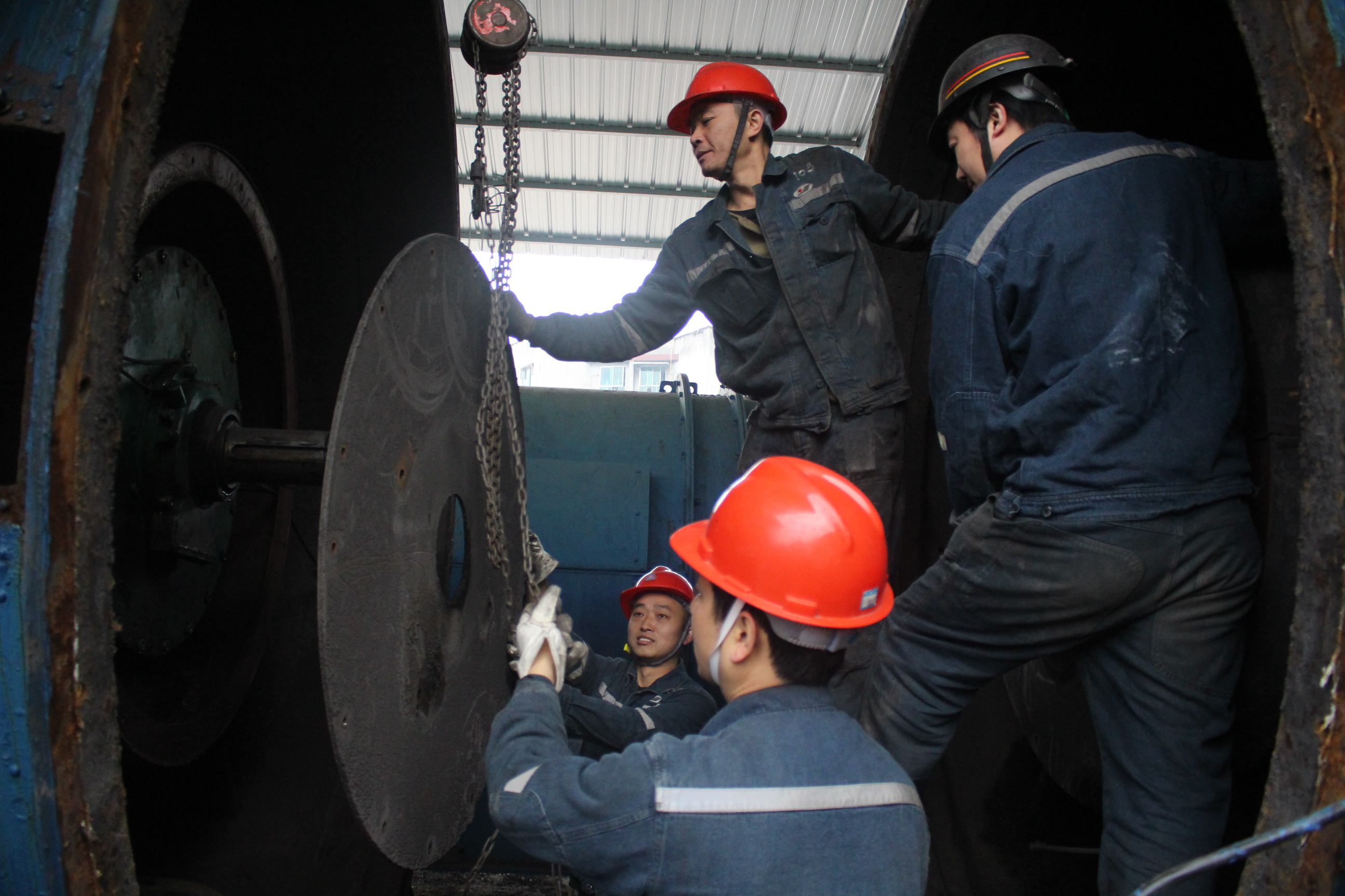 硕大体积的主要通风机打开“体腔”工序多、操作环节多,而现场工位受限并非人越多越好,况且故障时间是中班,结合班组实情,机电队电钳工在队管的组织下拉开了接力检修的序幕,从故障发生起,多名电钳工与时间赛跑,抢进度、找根源、除病灶,现场用手动葫芦拉主机、打开主机腔体、拆除风轮、清除受损叶片、检查轴承、维护防爆圈、打磨变形轴、清理备用配件、新风叶对应编码……,一级供电负荷的“康复”之旅尽在这些忙碌的身影中,没有专业的无影灯,只有普通的矿灯,束束光亮点缀着一幅新的劳动画卷;没有干净卫生的手术台,只有冷冰冰的材料和工具,并不整洁的抢修现场,那专注的神情和一丝不苟的技术钻研精神却在这里展现的淋漓尽致!