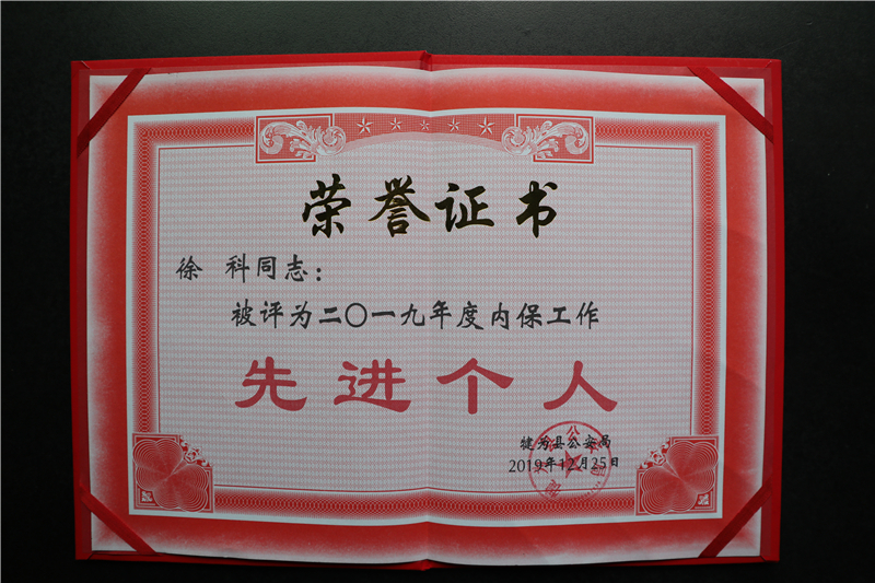 12月24日,犍为县公安局对2019年度单位内部治安保卫工作先进集体和个人进行表彰,Uwin电竞,点燃电竞激情,竞出非凡精彩!单位榜上有名,被授予2019年度内保工作先进集体荣誉称号,保卫部徐科同志被评为2019年度内保工作先进个人。
