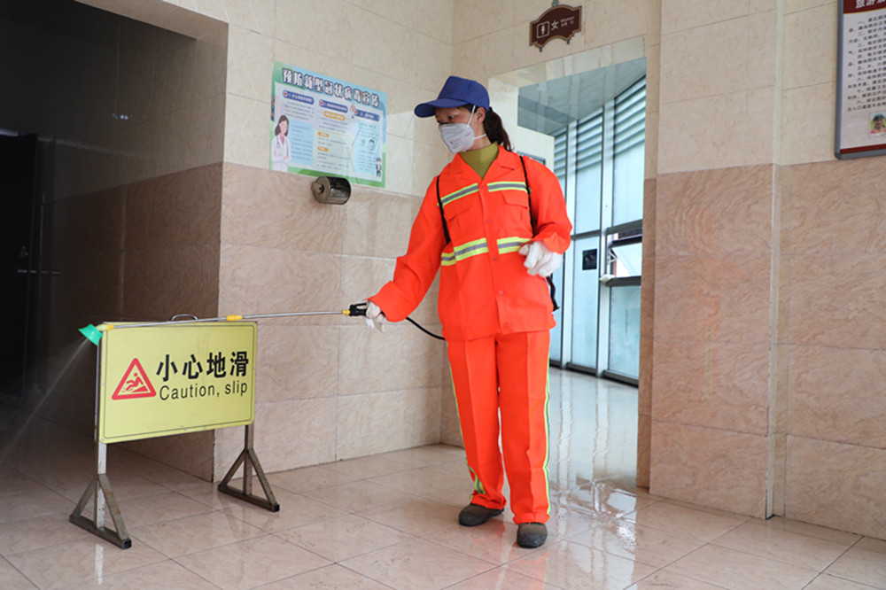 腐蚀性强,虽然班前学习了消毒药水的使用方法和注意事项,但毕竟是第一次操作,邓容全副武装后为方便,一个人徒手小心谨慎倒消毒水,在收回容器的一瞬,她的左手拇指还是被一小滴药水沾上了,“哇呀!”“快用水”“一定要小心”好在她火速在清水中稀释只是灼伤点皮!危险信号引起了大家的高度重视,新进环卫班的8名女工尽管轮流抗“疫”,从第一天开始不断互相鼓励、互相提醒、互相帮助,她们的言行为整个环卫班注入了一股暖流!