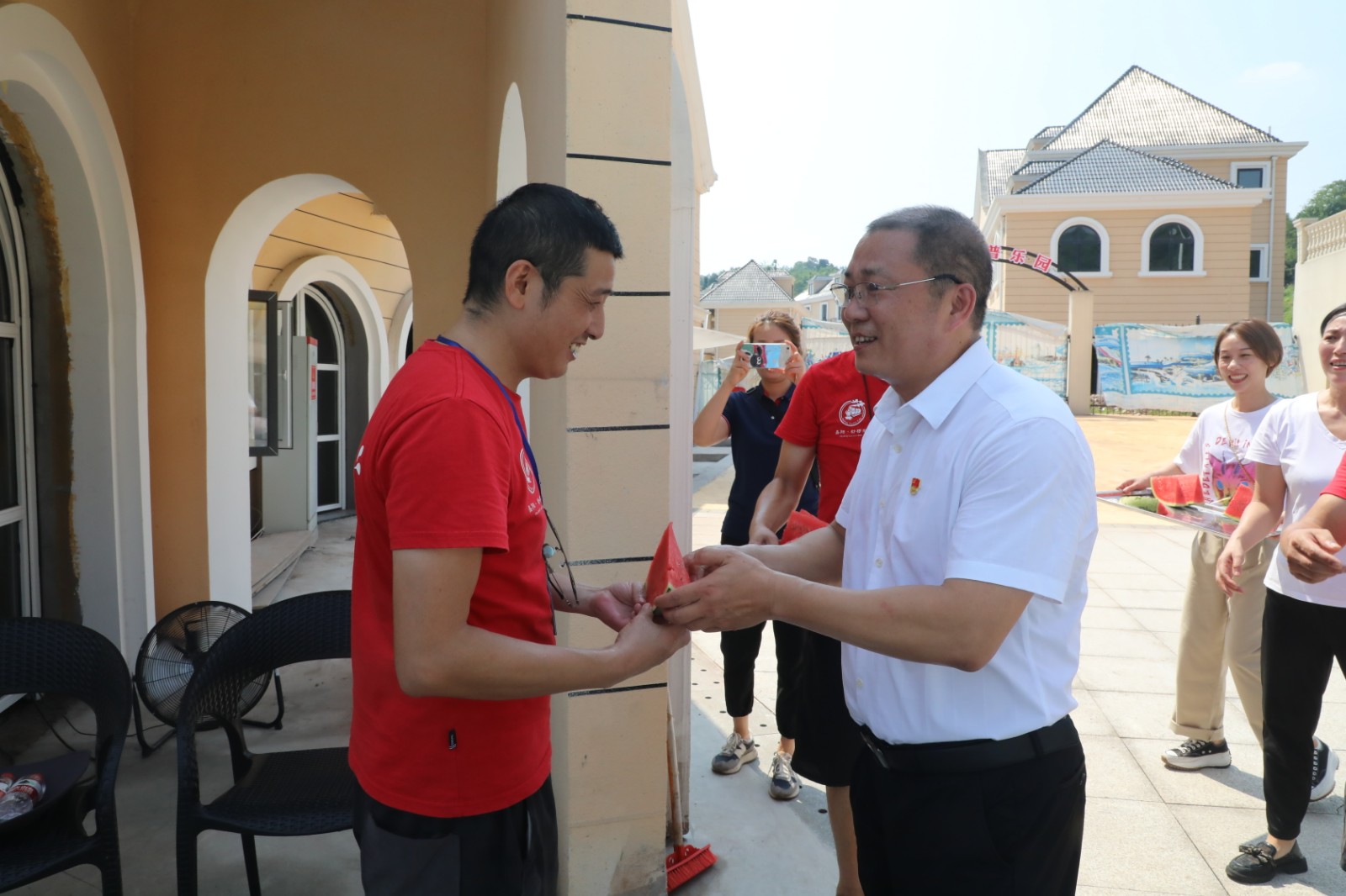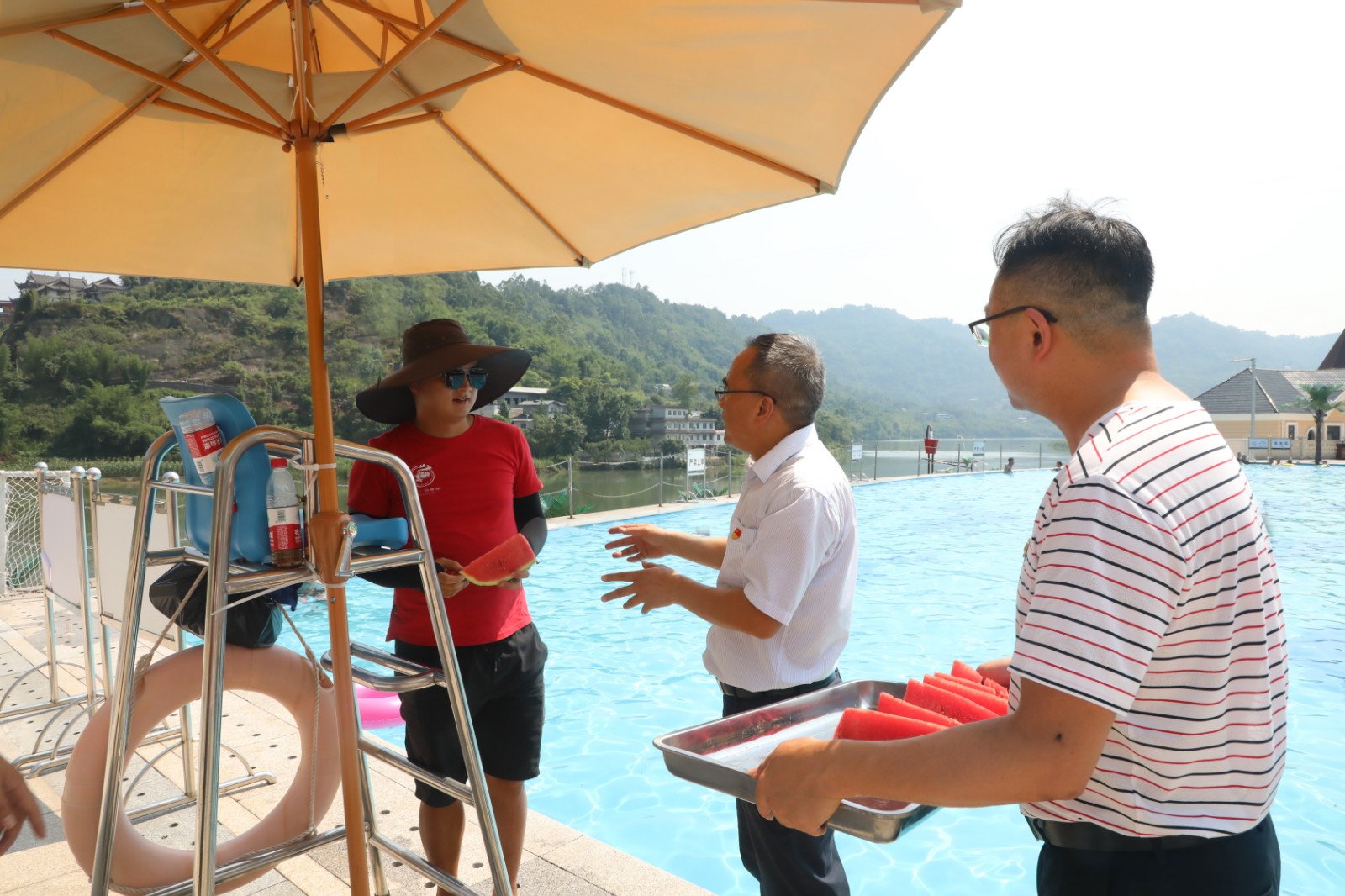 室外阳光灼人、热浪滚滚,小火车检修车间里也是热火朝天一派繁忙景象,工人师傅们正专注地给小火车机头进行大修保养。“师傅们,辛苦了!来歇一歇,吃口西瓜、喝点水……”公司领导将切好的西瓜和矿泉水递到职工手中,关心了解其工作、生活情况,要求相关负责人和管理人员一定要做好现场劳动保护和防暑降温工作,合理安排工作时间,切实保障工作人员的身心健康,要全力为职工营造一个舒适良好的工作环境。持续的高温,让桫椤湖嬉水乐园成了人们消暑玩耍的好地方,游客们或玩水上项目,或三五成群在泳池里打水仗,尽情享受水中的清凉和玩水的乐趣,可救生员却只能头顶烈日时刻盯着水面来回巡视,并不时提醒游客注意安全。公司领导与救生员亲切交谈,向他们顶烈日、战高温、保安全的敬业精神表示敬意,并叮嘱道:要精神百倍做好观察和防护,严谨细致守护好游客安全,同时,也叮嘱救生员在炎热天气下工作,要注意自我调节,保重身体,防止高温中暑及身体不适。公司领导的关心关爱似清风拂面,似烈日下的一杯凉茶沁人心脾,鼓舞着职工士气,为夏季安全工作提供了一份保障。
