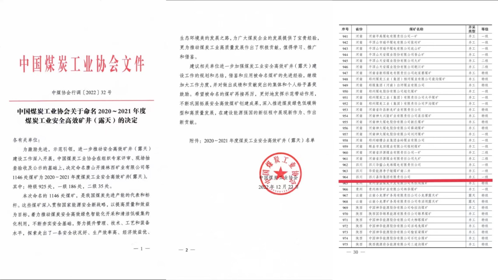 安全高效矿井是我国煤炭先进产能的代表和标杆。12月22日,根据《中国煤炭工业协会关于命名2020-2021年度煤炭工业安全高效矿井(露天)的决定》(中煤协会行调〔2022〕32号)文件,嘉阳煤矿从全国一千一百多家煤矿企业中脱颖而出,被命名为全国煤炭工业安全高效一级矿井(露天),再次蝉联这一殊荣。