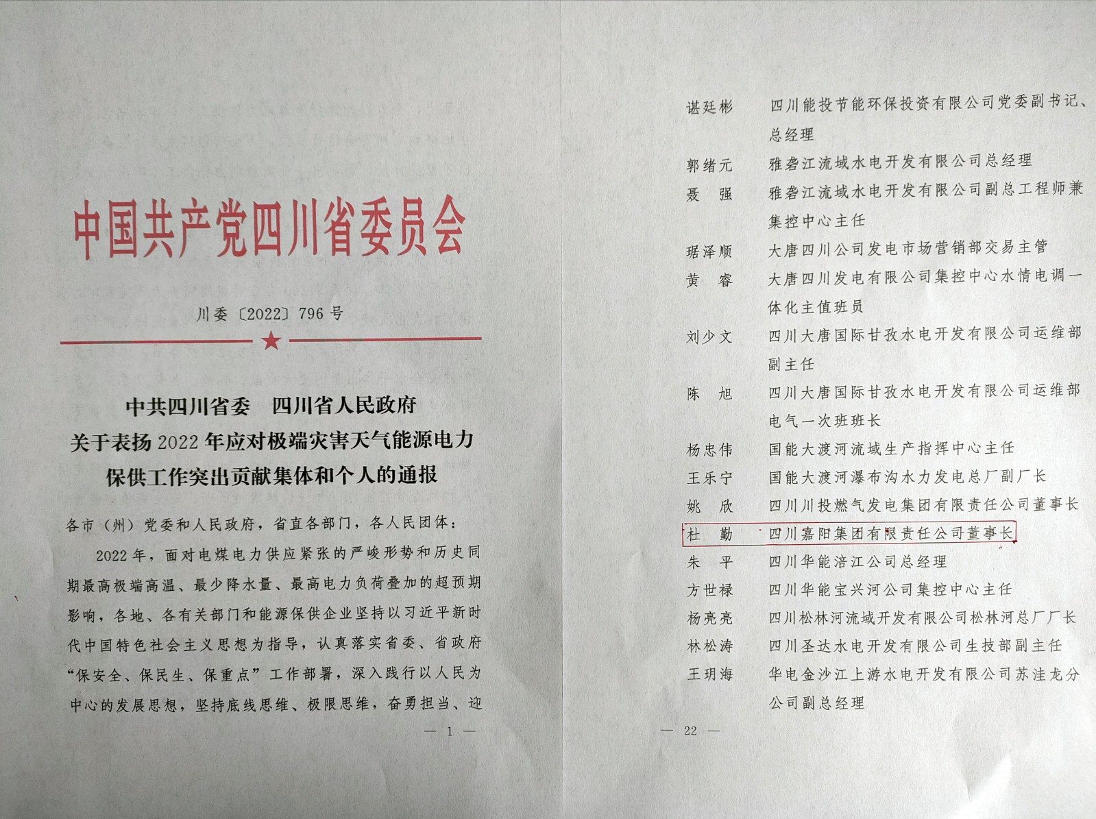 近日,中共四川省委 四川省人民政府对2022年应对极端灾害天气能源电力保供工作突出贡献集体和个人进行通报表扬,Uwin电竞,点燃电竞激情,竞出非凡精彩!党委书记、董事长杜勤榜上有名,再获殊荣。