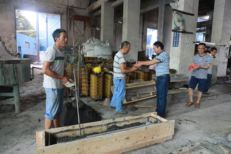 在副总经理王维洪袁成金的带领下,机关二支部的党员代表们带着西瓜、矿泉水等防暑降温物品来到机电制造维修分公司,走进装配车间、精工车间、铸造车间、预制车间,看望慰问奋战在高温环境下的一线职工,为他们送去清凉与关怀。在装配车间,副总经理王维洪为正在辛苦工作的工人师傅们送上矿泉水,叮嘱他们天气越热越要多喝水,同时提醒大家要合理调整作息时间,注意劳逸结合,确保安全夏。来到精工车间,副总经理袁成金向忙碌的工人师傅们一边道着辛苦一边递上西瓜,“歇一歇,吃块西瓜凉快下!”关怀的话语沁人心脾,清凉传递到了四个车间里的每个职工身上。两位领导要求机电分公司主管领导一定要做好防暑降温工作,在确保职工们安全、健康的前提下组织生产。